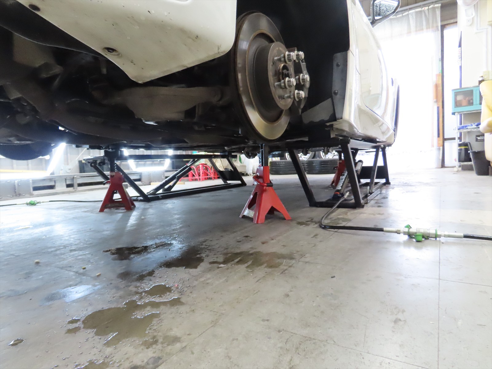 作業場の床の構造上、リフター設置が出来ない為に移動式油圧タイプのジャッキを使用して車体を上げています。
