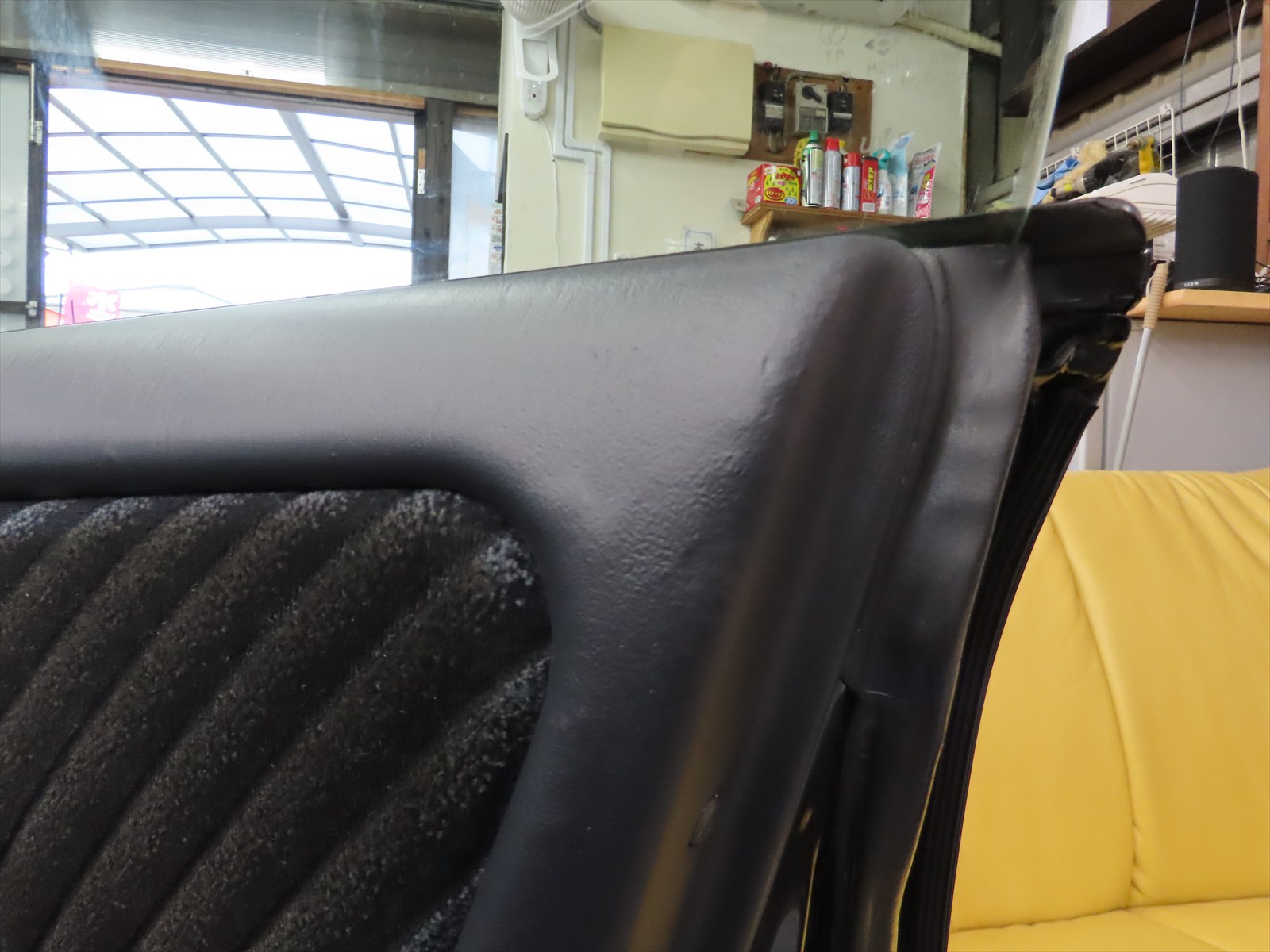 ビニールレザー表皮の内部素材に傷みが生じていて所々に凹凸が出来てしまっている状態でした・・。
