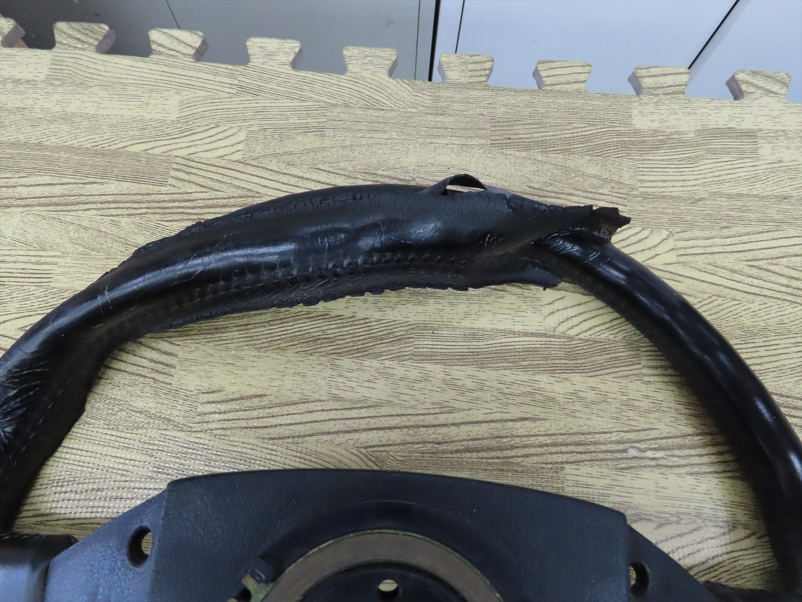 純正のステアリングハンドルの本革の状態が写真で見ても一目で危険な状態であるとわかりますよね~!(;^_^A