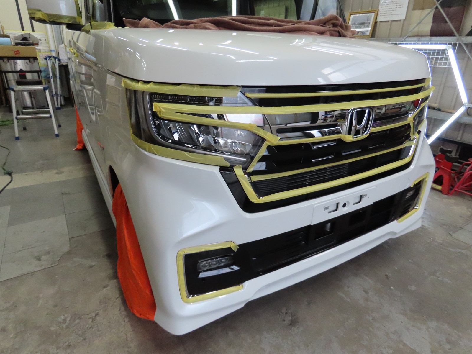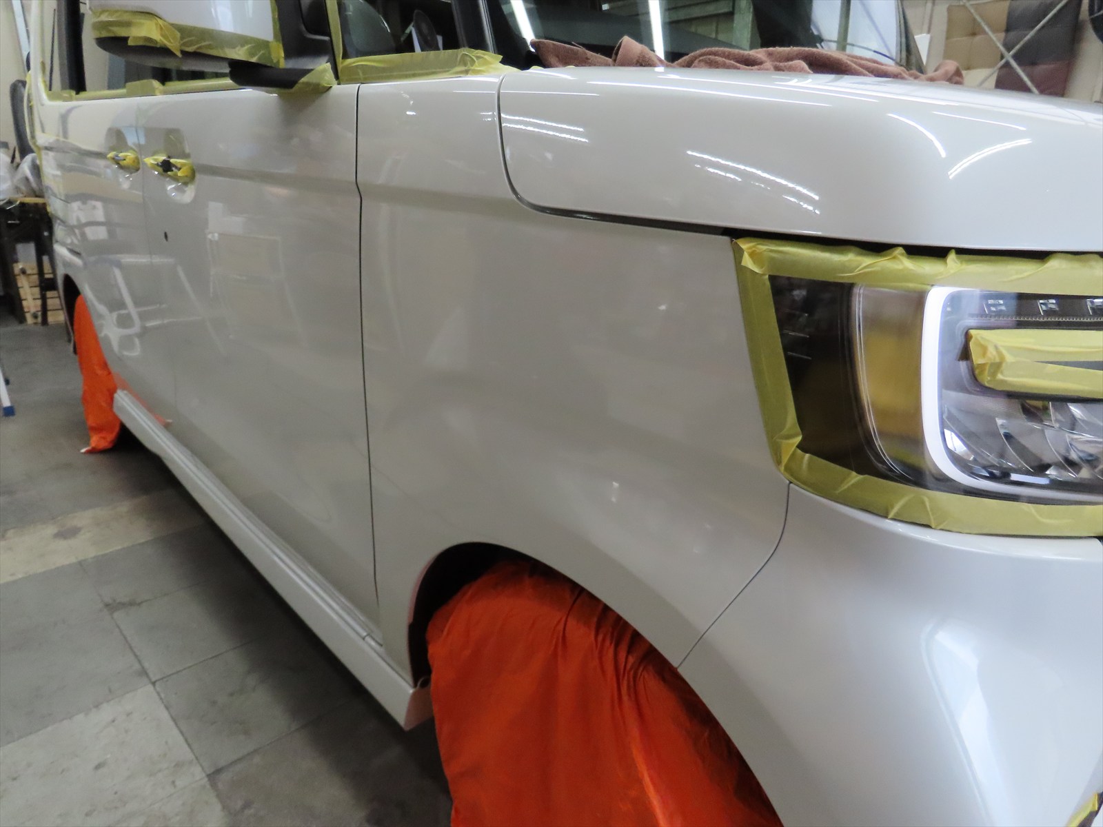 ホンダ:N-BOXカスタムのボディ磨き仕上げとSPガラスコーティング施工のご依頼を戴きました!(ボディ下地磨き前編)