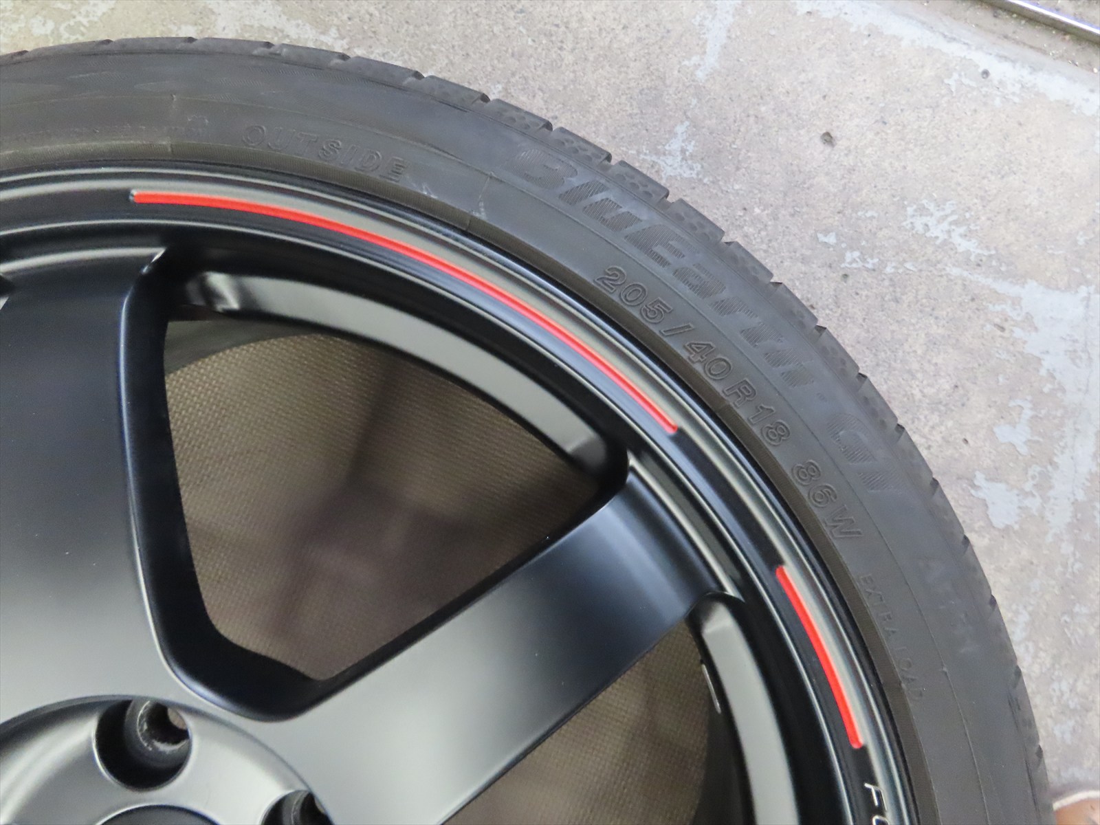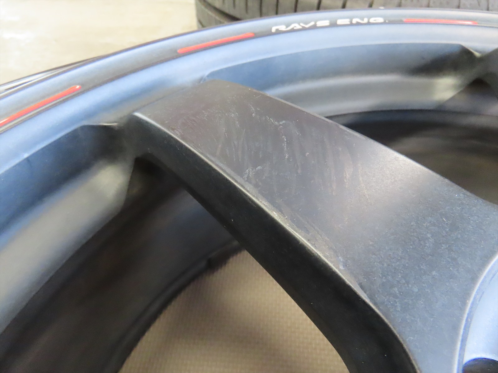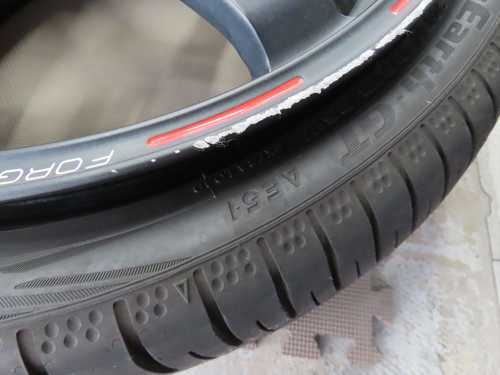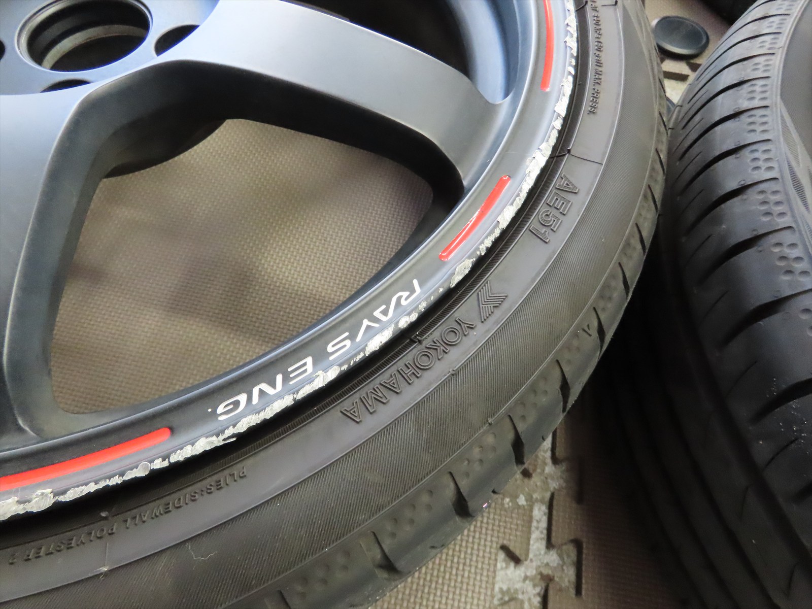 写真でも見てもお分かりかと思いますが、マットブラック塗装仕上げのホイールにマニシング(機械切削加工)による文字・赤色ライン・ブランドロゴの印字がありますよね!・・・この印字の外周側に長い範囲のガリ傷が確認できます。(;^_^A
