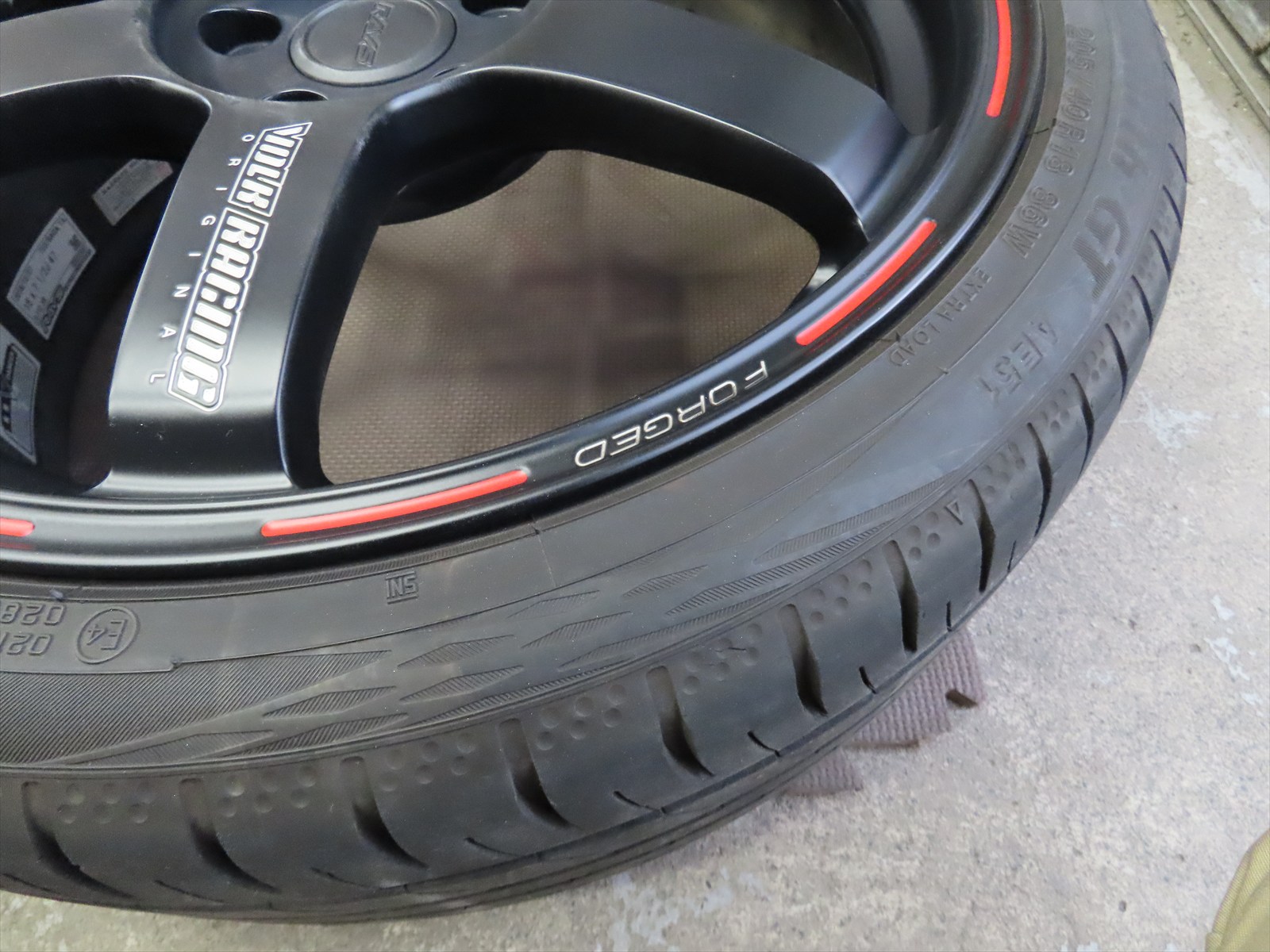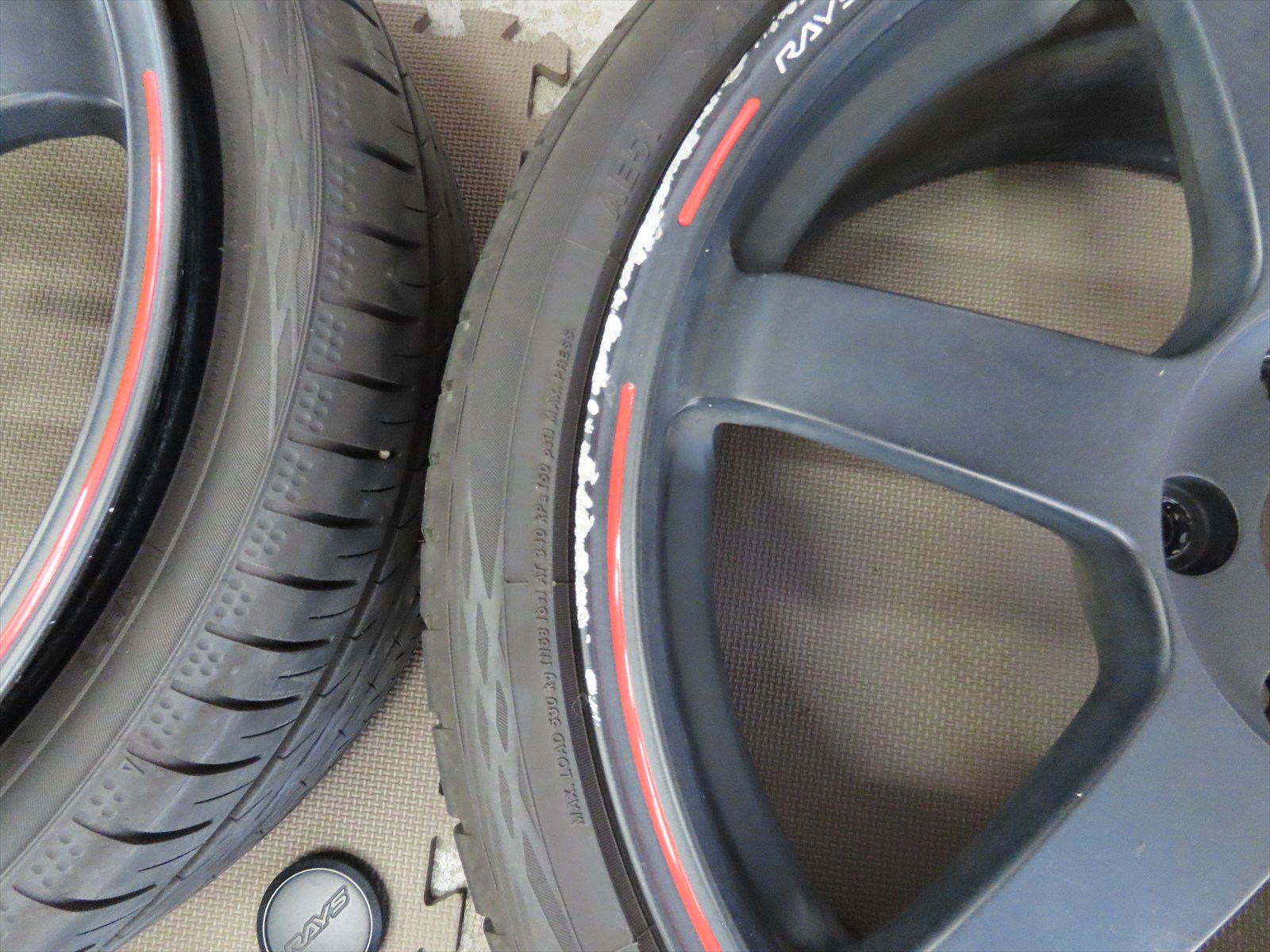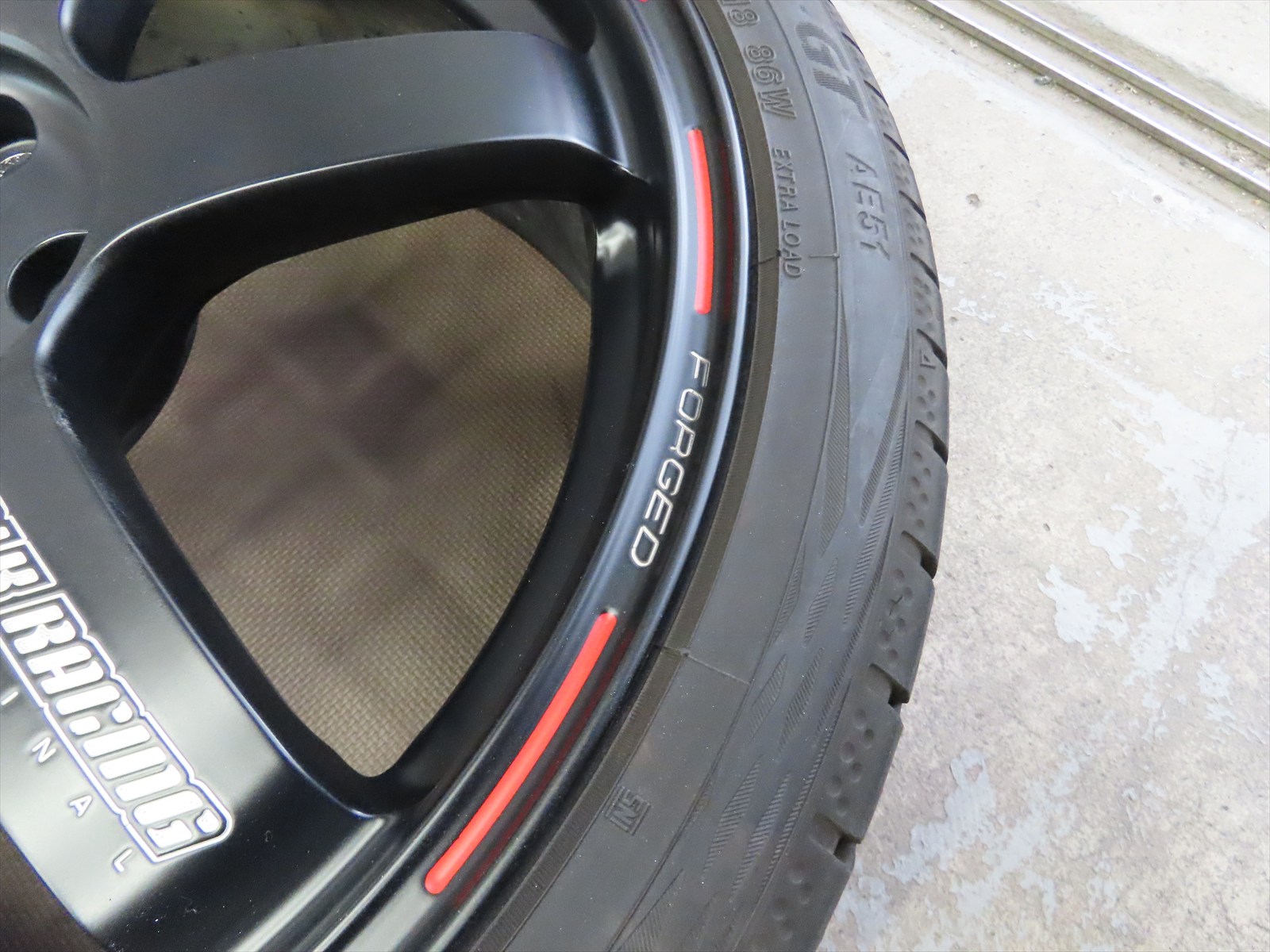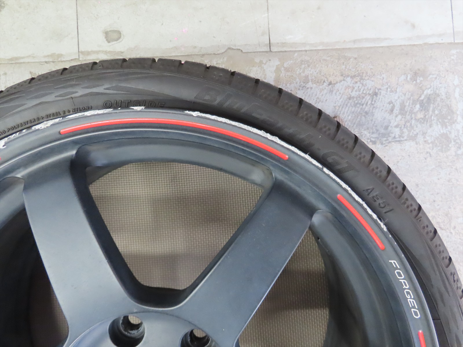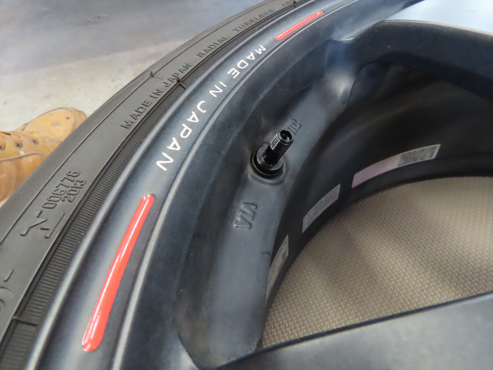 写真でも見てもお分かりかと思いますが、マットブラック塗装仕上げのホイールにマニシング(機械切削加工)による文字・赤色ライン・ブランドロゴの印字がありますよね!・・・この印字の外周側に長い範囲のガリ傷が確認できます。(;^_^A